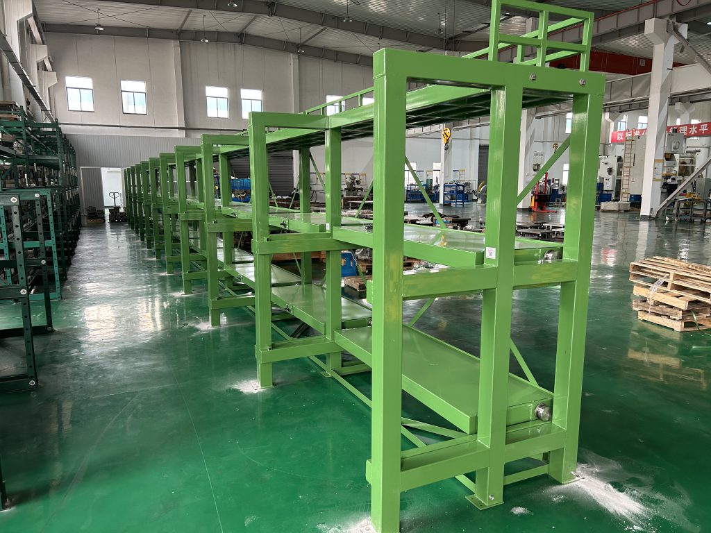 2023年4月12日江蘇海安客戶手搖模具架安裝現場,貨架整體需用RAL6010顏色,頂部安裝防護欄;